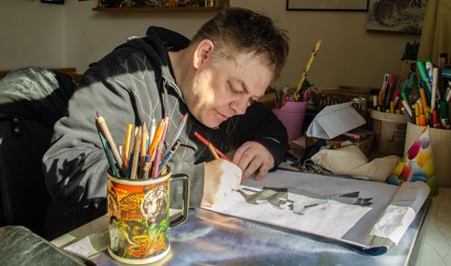 Guten Tag, ich bin Herr H.. Mein Lieblingstier ist die Katze. Ich male sie sehr gerne. Ich kann sehr gut malen. Viele Betreute bei uns malen auch, klecksen aber nur rum oder malen Wände an. Die sollten besser Theater spielen.